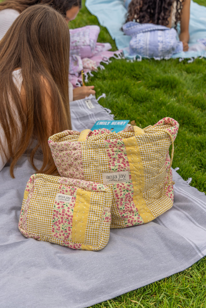 Every bag is handcrafted from a patchwork quilt in this color combination. Due to the manual process the grouping of patches may differ from bag to bag making each piece unique.